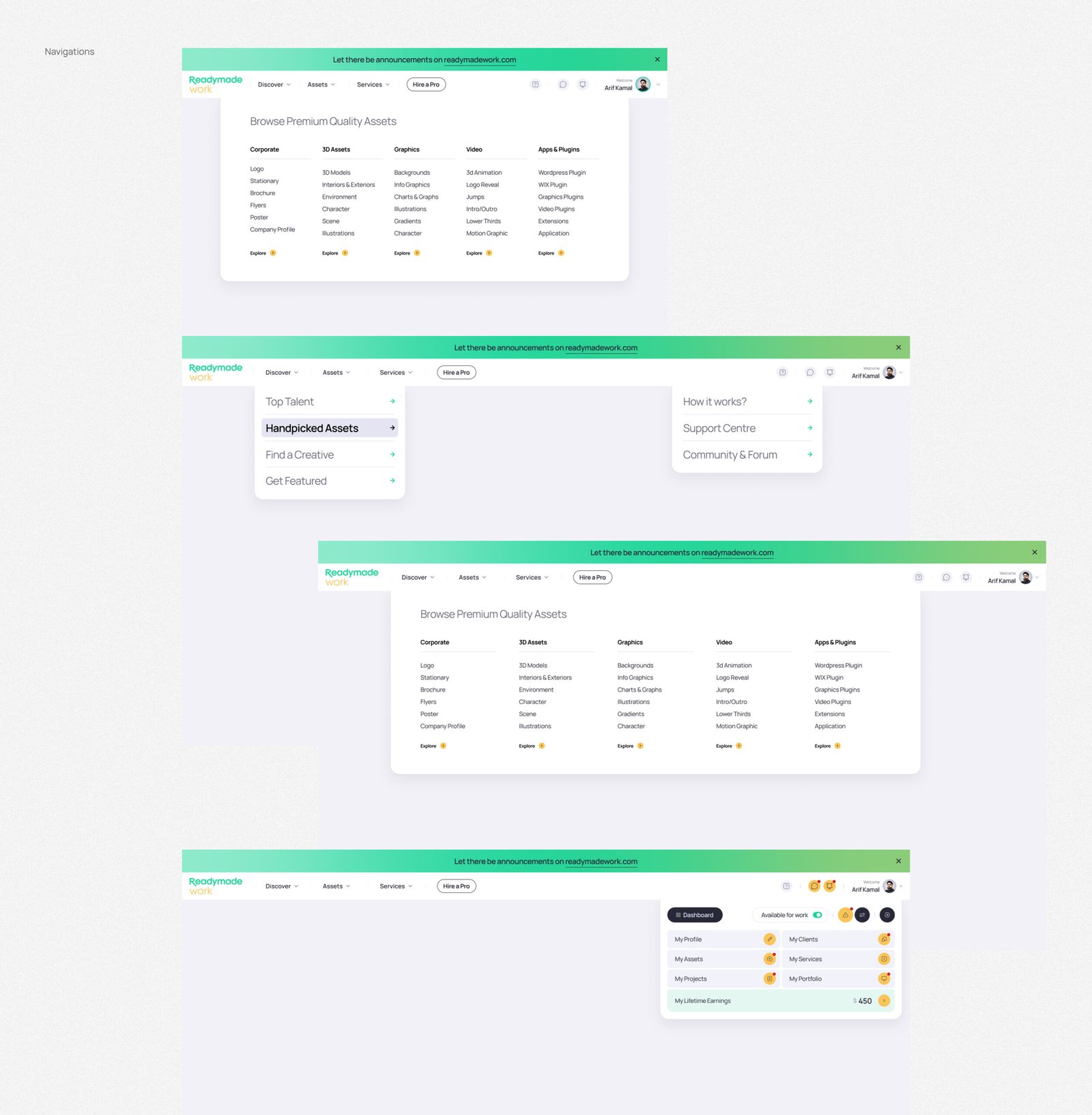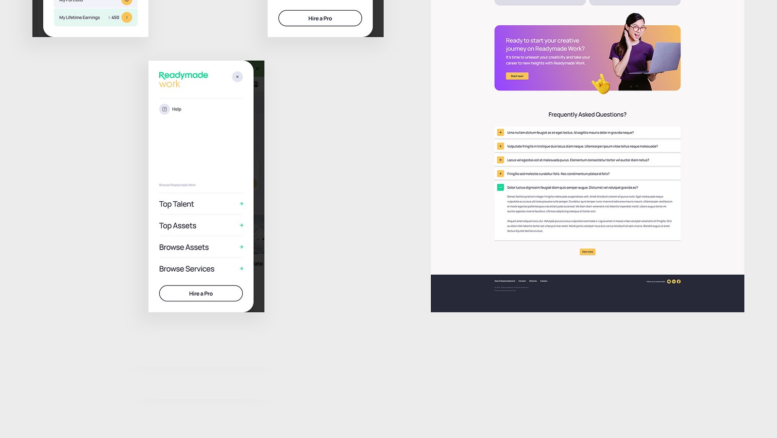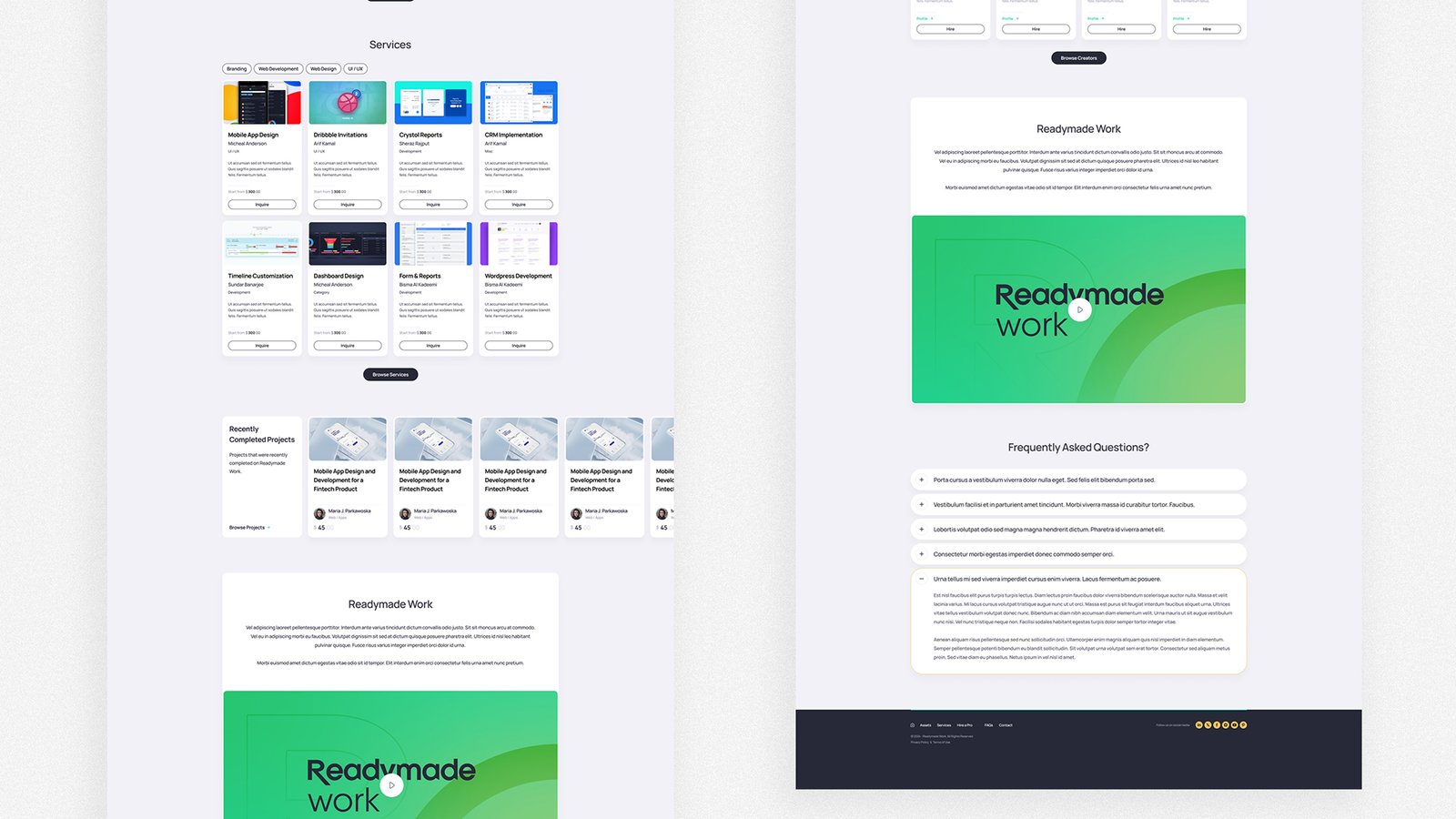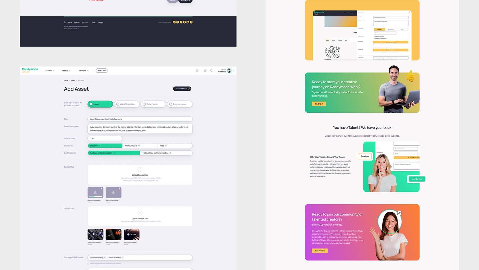 We designed and developed Readymade Work from wireframes to a production-ready platform: UI/UX, marketplace architecture, secure payment flows, creator & buyer onboarding, and a proprietary console for platform management. The build includes asset and services listings, featured creators, project posting, and CMS-driven support and blog hubs.